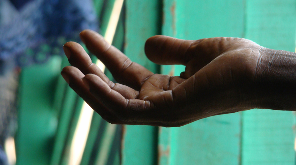 Il était assis pour mendier sur le bord de la route.